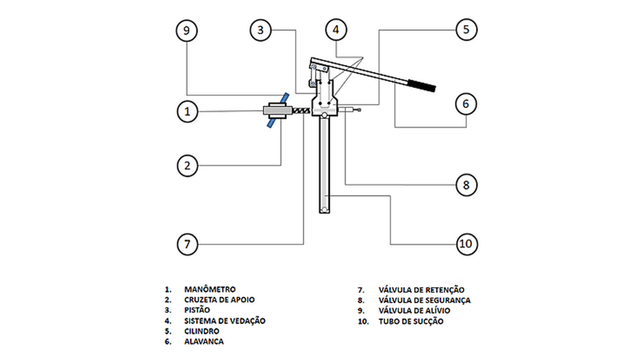 -Construída em aço inox e latão, sem reservatório. -Corpo: Cilindro em aço Inox 304. -Tubo de sucção com duplo sistema de válvulas na entrada. -Válvula de segurança e regulagem de pressão. -Válvula de retenção. -Válvula de bloqueio e alívio de pressão. -Manômetro glicerinado em caixa de inox. -Kit-mangueira de alta pressão com terminais de ligação. -Conexão de saída: R 1/2 NPT. -Acionamento manual por meio de alavanca. -Dimensões aproximadas: C 450 x L 90 x A 510 mm. -Peso aproximado: 7 – 10 kg. -NCM: 84132000. -Fluidos utilizáveis: água, óleo lubrificante, glicerina. -Vazão aproximada: 1,0 a 1,5 l/min. -Marca: NOVA FREMI. -Fabricante: Metalúrgica Nova Fremi Ltda.