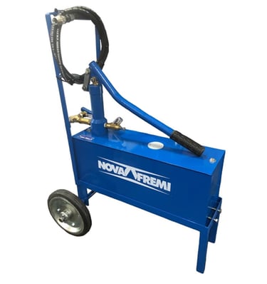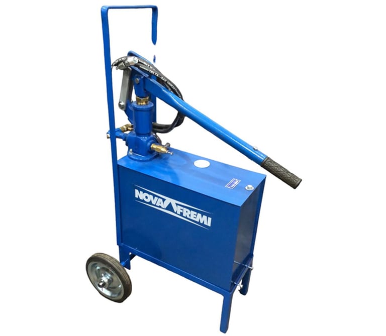 Bomba manual para teste hidrostático. Modelo 860N-S Montada em reservatório de 30 litros sobre carrinho de transporte com rodas de borracha maciça.