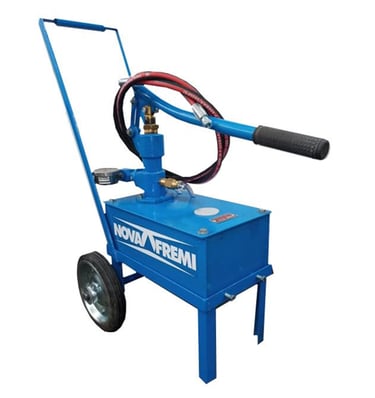 Bomba manual para teste hidrostático. Modelo 850N-S Montada em reservatório de 07 litros sobre carrinho de transporte com rodas de borracha maciça.