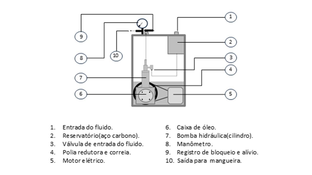 -Caixa metálica em aço carbono – Volume 5 litros. -Corpo: Cilindro em latão . -Válvula de entrada. -Válvula de bloqueio e alívio de pressão. -Manômetro glicerinado em caixa de inox. -Kit-mangueira de alta pressão com terminais de ligação. -Conexão de saída: R 1/4 NPT. -Acionamento: motor elétrico trifásico - 220/380 v - de 1 a 3 cv - 60 hz (Dependendo da capacidade de pressão), correias e polias redutoras. -Chave de partida "Liga-Desliga) -Dimensões aproximadas: C 650 x L 350 x A 900 mm. -Peso aproximado: 60 kg. -NCM: 84138100. -Fluidos utilizáveis: água, óleo lubrificante, glicerina. -Vazão aproximada: 0,6 l/min, dependendo da capacidade de pressão selecionada. -Marca: NOVA FREMI. -Fabricante: Metalúrgica Nova Fremi Ltda.
